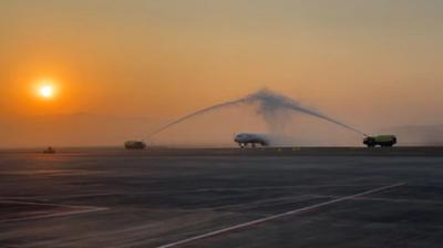 नवी मुंबई हवाई अड्डे से विमान ने भरी पहली वाणिज्यिक उड़ान, मिला वाटर कैनन सैल्यूट