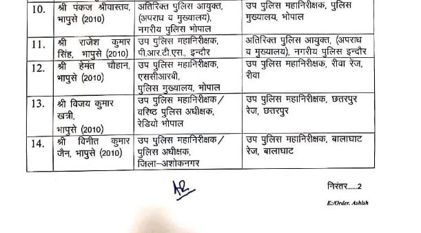 मयंक अवस्थी को धार जिले के पुलिस अधीक्षक की जिम्मेदारी दी गई है। इससे पहले वे पुलिस मुख्यालय में सहायक पुलिस महानिरीक्षक के पद पर तैनात थे। वहीं राजीव कुमार मिश्रा को पुलिस मुख्यालय (सहायक पुलिस महानिरीक्षक) के पद से स्थानांतरित करके अशोकनगर जिला पुलिस अधीक्षक बनाया गया है। राजेश सिंह भोपाल रेंज के उप पुलिस महानिरीक्षक बनाए गए हैं।