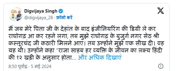 दिग्विजय सिंह अपनी पोस्ट में लिखा कि ‘मैं जब मेरे पिता जी के देहांत के बाद इंजीनियरिंग की डिग्री लेकर राघोगढ़ आकर रहने लगा, तब मुझे राघोगढ़ के बुजुर्ग नगर सेठ कस्तूरचंद कठारी मिलने आए। तब उन्होंने मुझे एक सीख दी। वो ये थी। उन्होंने कहा ‘राजा साहब हर व्यक्ति के जीवन का लक्ष्य हिंदी की 12 खड़ी के अनुसार होता है। ‘क’ से कमाओ- इतना कमाओ कि आपके परिवार को कमा कर ‘ख’ से खिला सके। ‘ग’ से गहना – जो बचत हो उससे गहने बनाओ। ‘घ’ से घर- गहना ख़रीदकर बचत से घर बनाओ। ‘ङ’ से नाम- घर बनाने के बाद अगर बचत हो तो नाम कमाओ।’