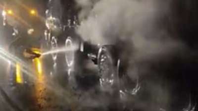 टायर फटने के बाद ट्रक में लगी आग, समय रहते बुझाई गई